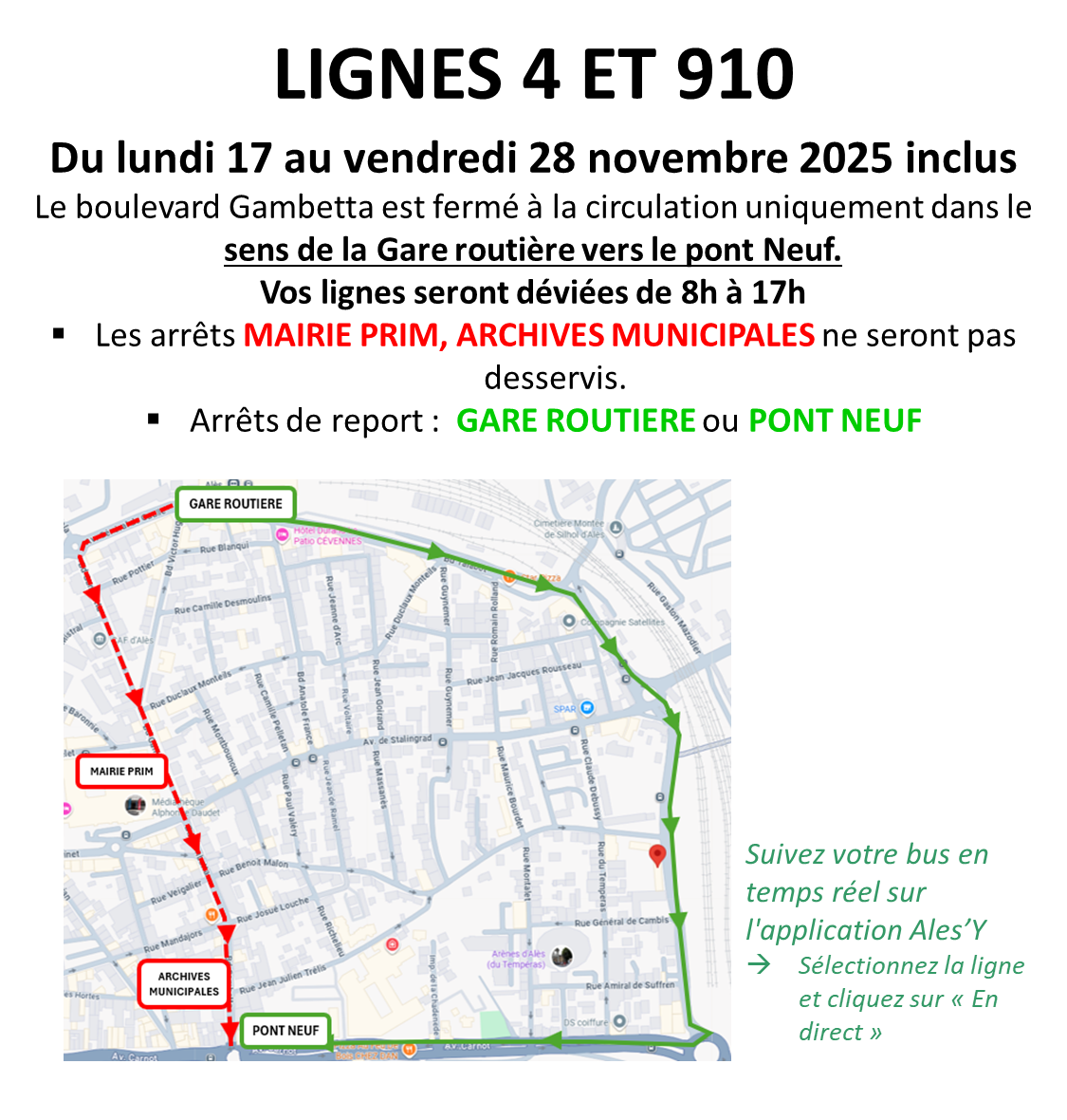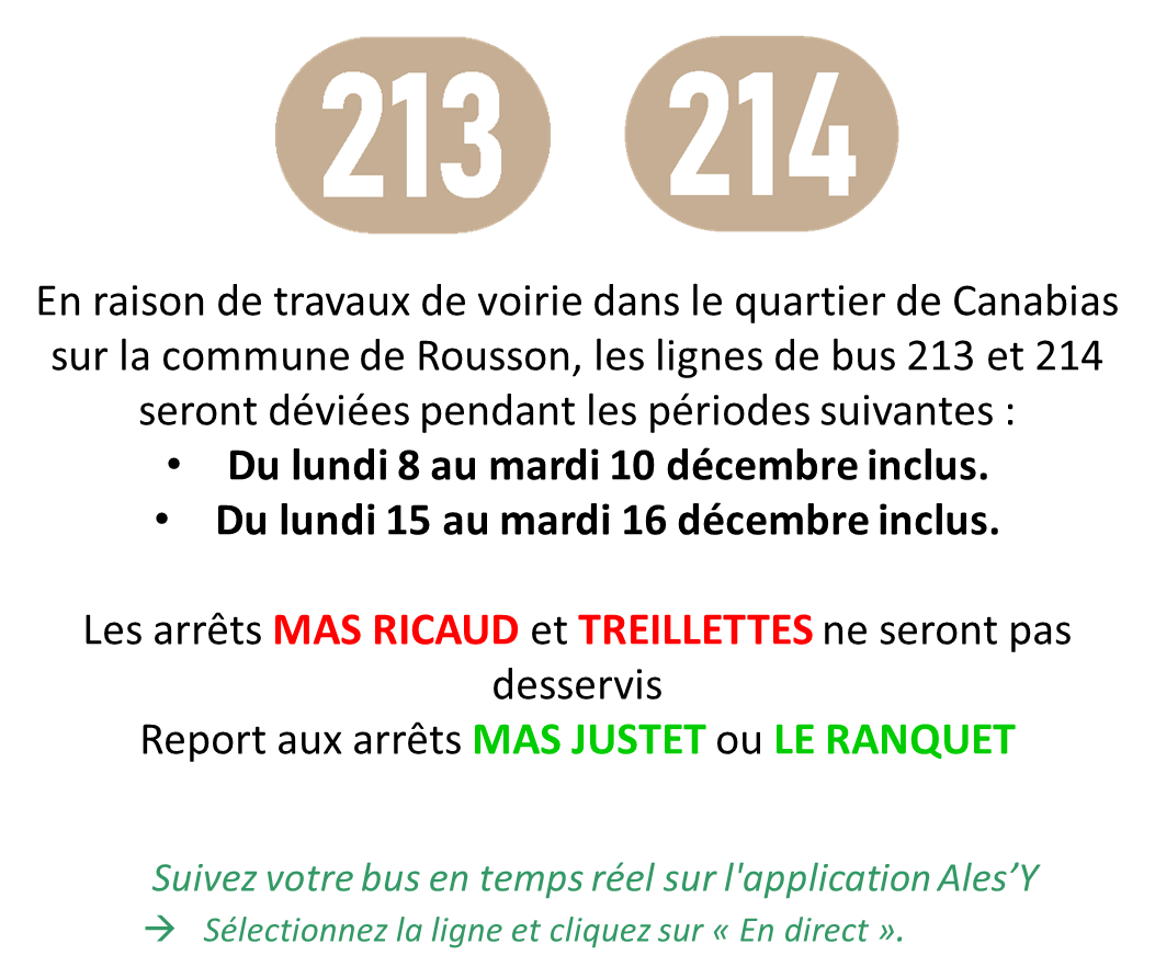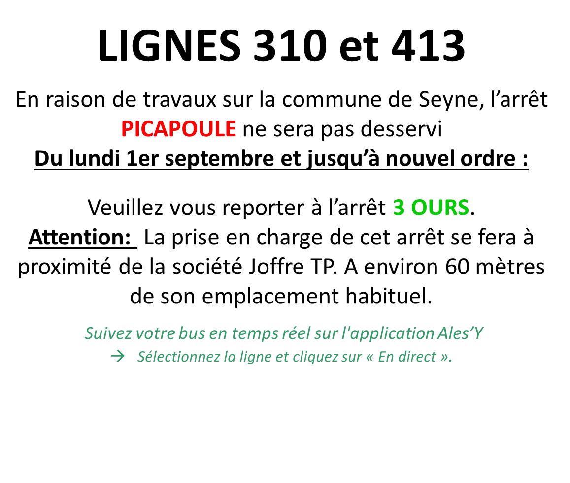 En raison de travaux sur la commune de St-Christol-lez-Alès, à partir du lundi 9 décembre 2024 et pour une durée de 24 mois, l'arrêt Pyramide sera déplacé légèrement en amont.