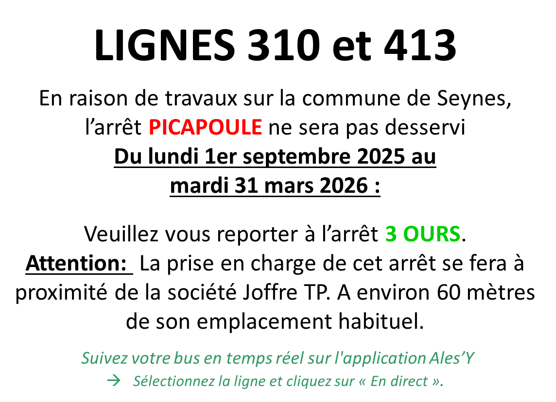 En raison de travaux sur la commune de St-Christol-lez-Alès, à partir du lundi 9 décembre 2024 et pour une durée de 24 mois, l'arrêt Pyramide sera déplacé légèrement en amont.